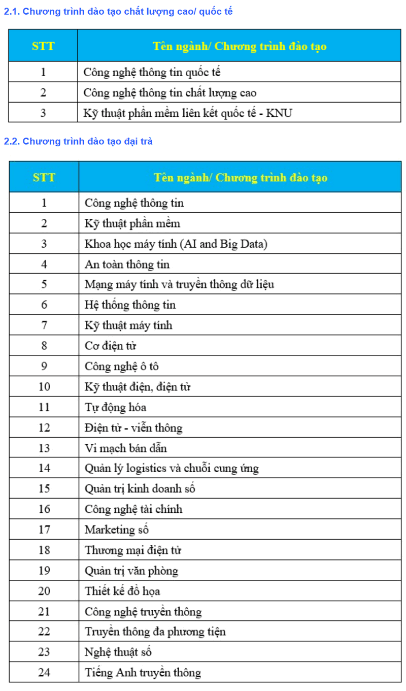 Danh sách ngành đào tạo theo phương thức Điểm thi THPT