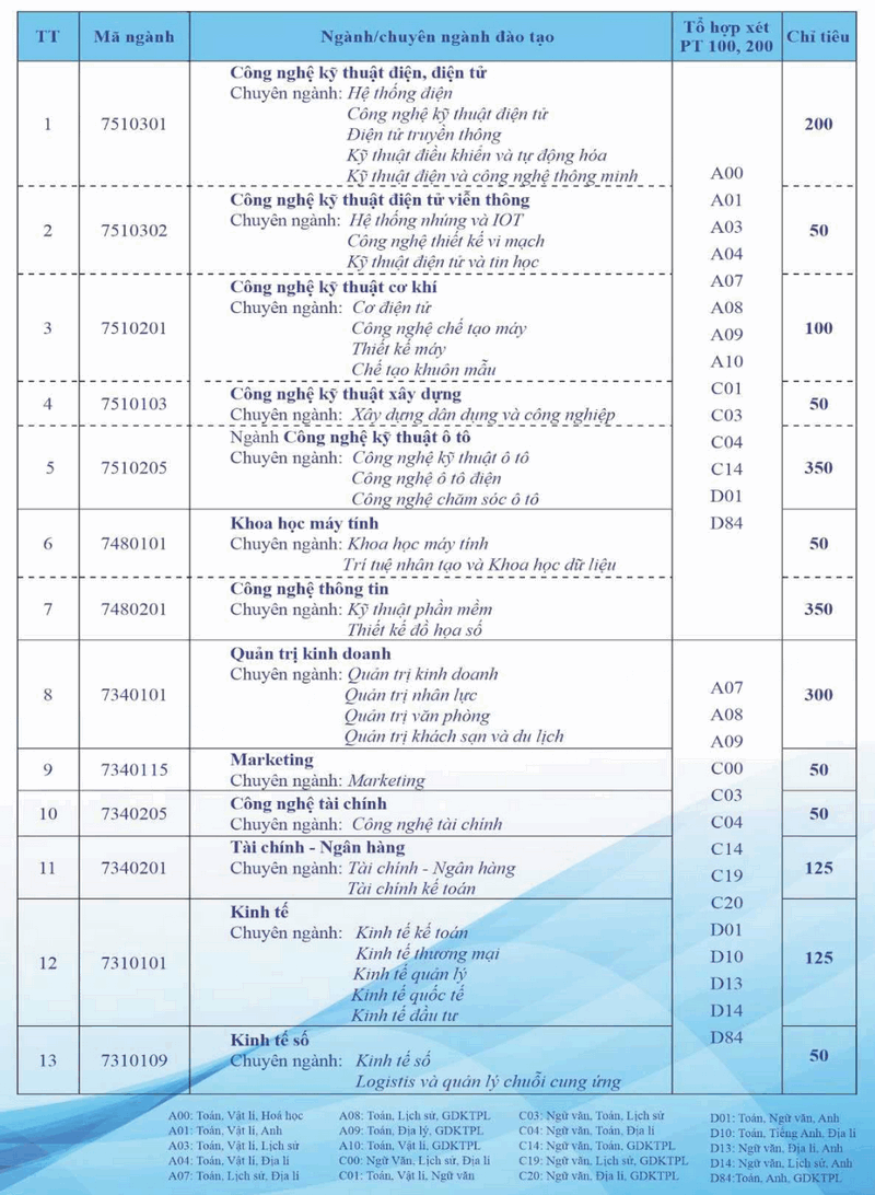 Danh sách ngành đào tạo theo phương thức Điểm thi THPT