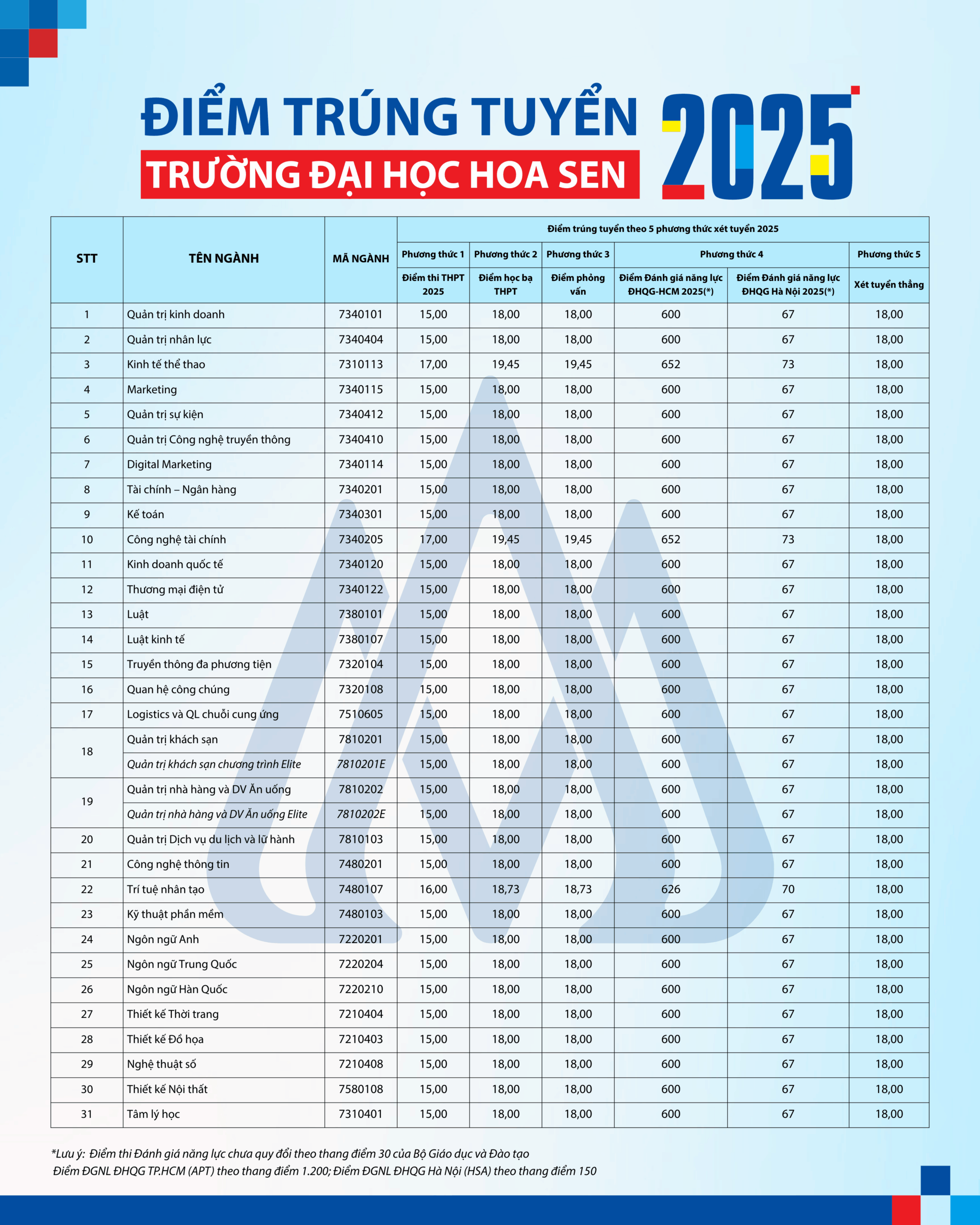 Trường Đại học Hoa Sen (HSU) vừa công bố điểm trúng tuyển chính thức năm 2025 theo 5 phương thức xét tuyển cho 31 ngành đào tạo chính quy, với mức điểm dao động từ 15 đến 19,45 điểm. Cụ thể, theo phương thức thi tốt nghiệp THPT, nhiều ngành sáng tạo và dịch vụ như Quản trị kinh doanh, Thiết kế thời trang, Ngôn ngữ Anh… yêu cầu từ 15 – 17 điểm, trong đó Công nghệ tài chính và Kinh tế thể thao là nổi bật nhất với mức 17 điểm. Xét theo học bạ và các phương thức khác (phỏng vấn, ĐGNL, tuyển thẳng), ngưỡng điểm cao nhất đã lên tới 19,45 điểm, mở ra cơ hội rộng hơn cho thí sinh yêu thích các ngành năng động, sáng tạo và liên kết quốc tế