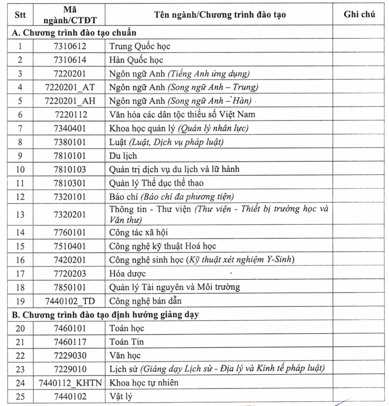 | 1 | 7220113 | Ngôn ngữ và Văn hóa các dân tộc thiếu số Việt Nam | 0 | ĐT THPT | C00; C14; D01; D84 |