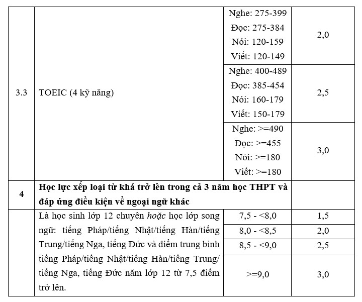 + Đối tượng 4: Thí sinh có học lực xếp loại từ khá trở lên trong cả 3 năm học THPT và là học sinh lớp 12 chuyên hoặc học lớp song ngữ: tiếng Pháp/tiếng Nhật/tiếng Hàn/tiếng Trung/tiếng Nga, tiếng Đức và điểm trung bình tiếng Pháp/tiếng Nhật/tiếng Hàn/tiếng Trung/ tiếng Nga, tiếng Đức năm lớp 12 từ 7,5 điểm trở lên và được điểm cộng trong xét tuyển.