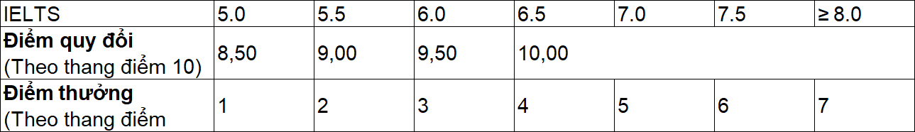 Quy định về quy đổi điểm chứng chỉ IELTS (Academic) thành điểm tiếng Anh để xét tuyển các tổ hợp A01, D01, D04, D07, D10 và mức điểm thưởng
