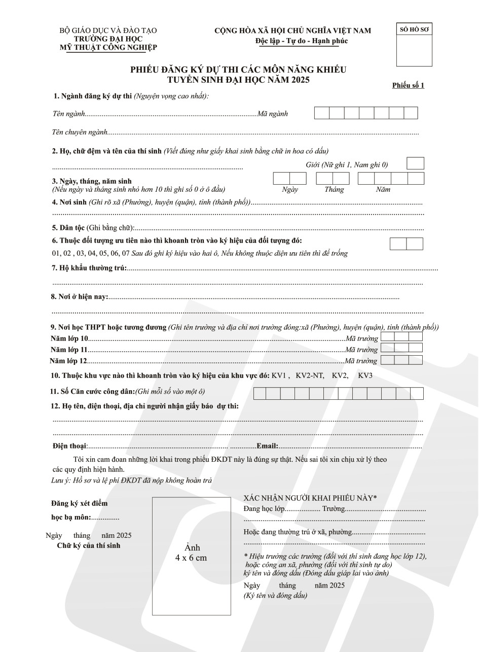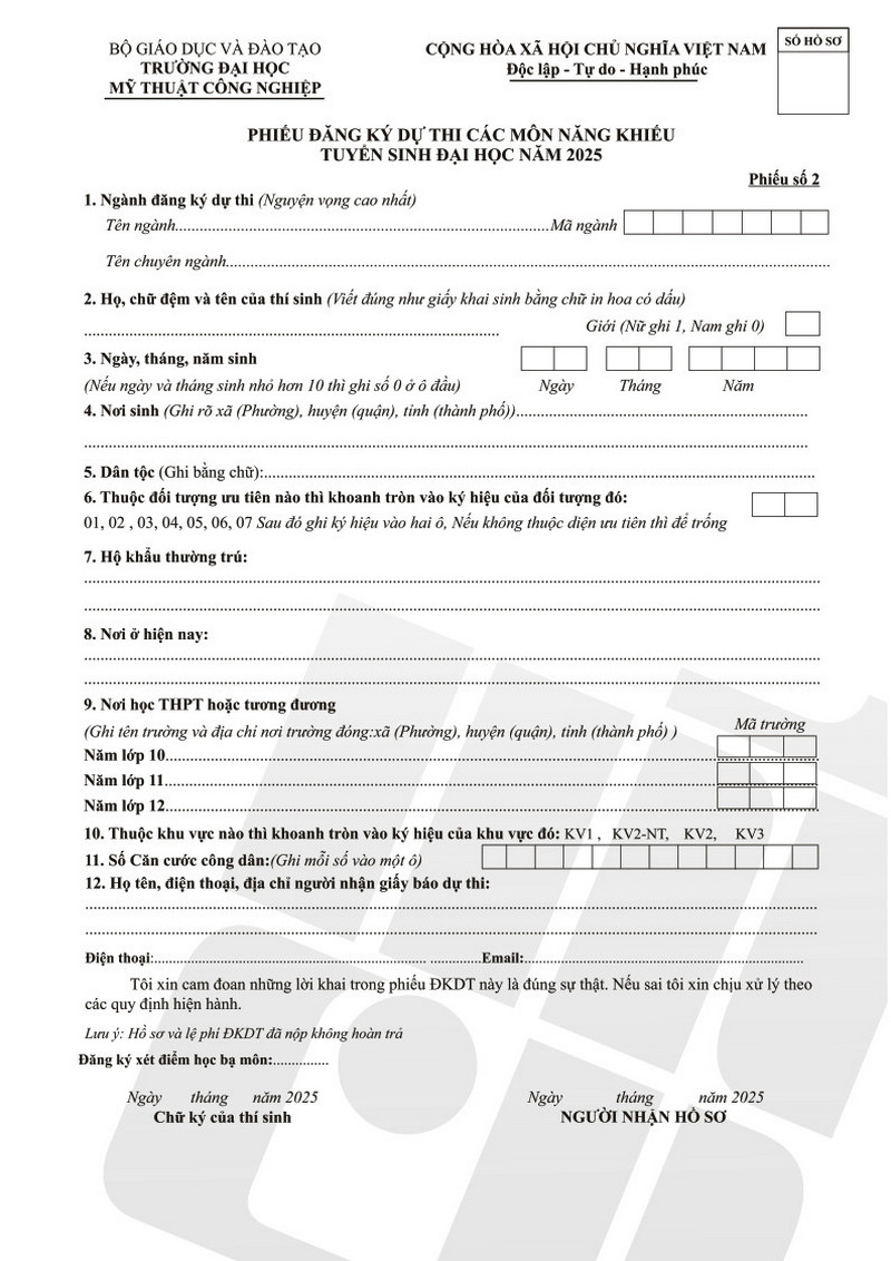 + Phiếu đăng ký dự thi các môn năng khiếu (theo mẫu của trường ĐHMTCN)