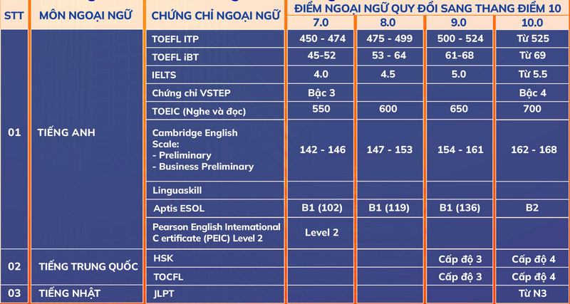 Các ngành có tổ hợp môn xét tuyển có môn tiếng Anh, tiếng Trung Quốc, tiếng Hàn, tiếng Nhật được sử dụng quy đổi điểm chứng chỉ ngoại ngữ theo quy định của HUFLIT.