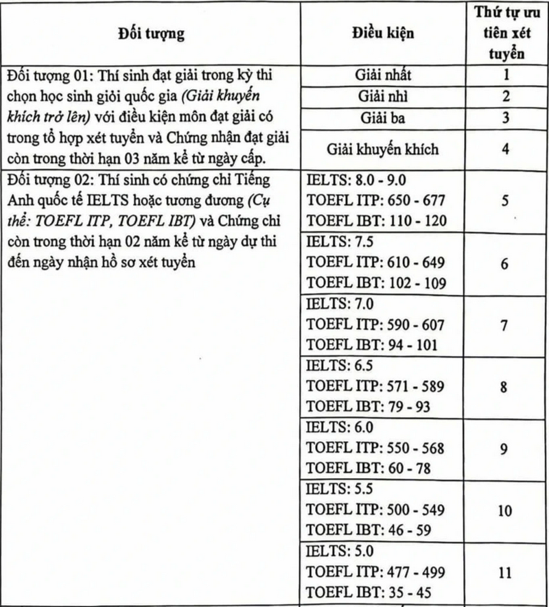 Thí sinh có IELTS 8.0 trở lên đứng vị trí ưu tiên thứ 4, chỉ sau giải khuyến khích học sinh giỏi quốc gia.
