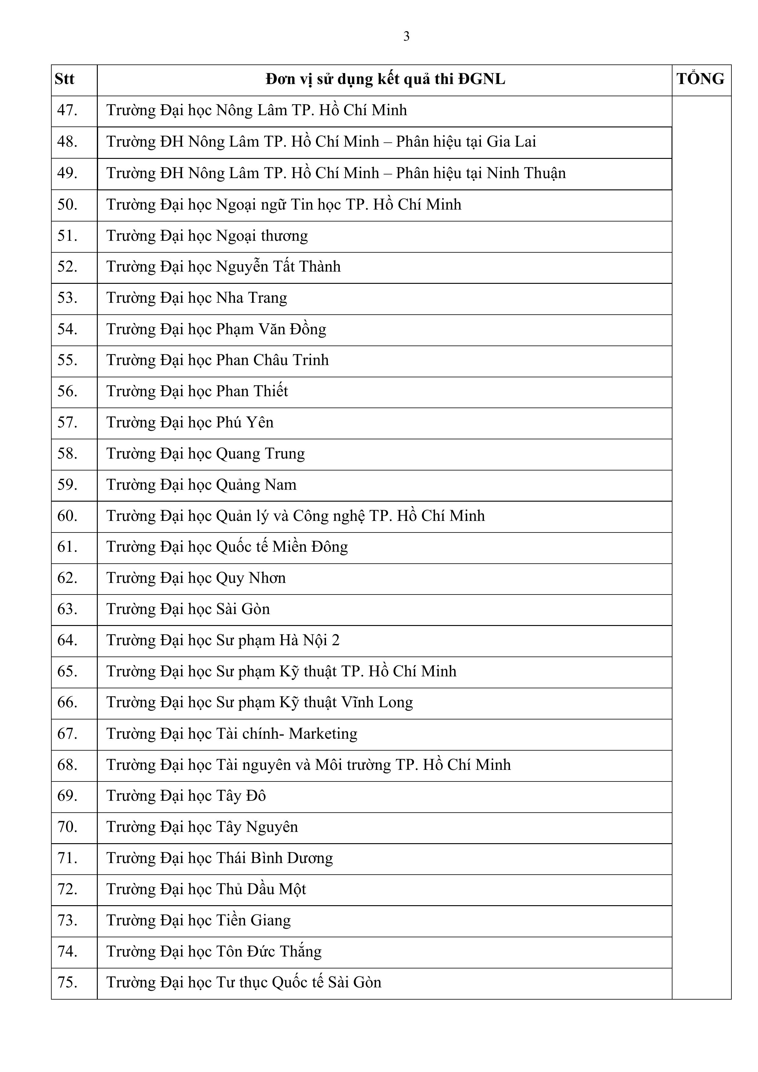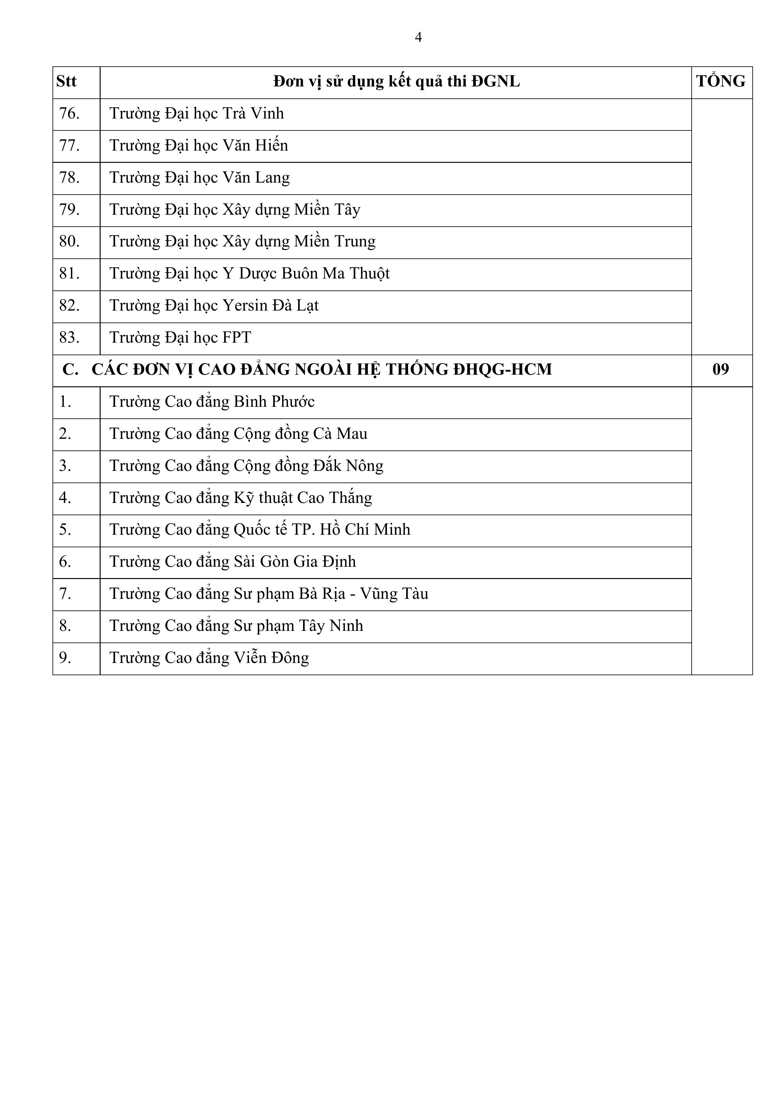 Dưới đây là danh sách các trường đại học, cao đẳng sử dụng kết quả của kỳ thi đánh giá lực – Đại học Quốc gia TP.HCM