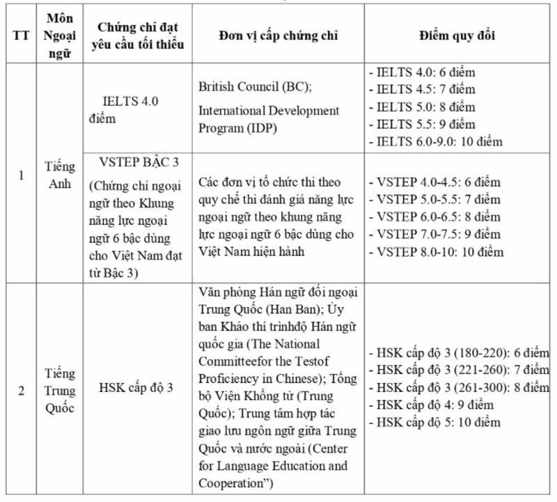 Nhà trường quy định quy đổi điểm đối với các thí sinh có chứng chỉ ngoại ngữ Tiếng Anh, Tiếng Trung Quốc để sử dụng trong xét tuyển ĐHCQ đối với các tổ hợp có môn Tiếng Anh hoặc tiếng Trung Quốc. Cụ thể như sau: