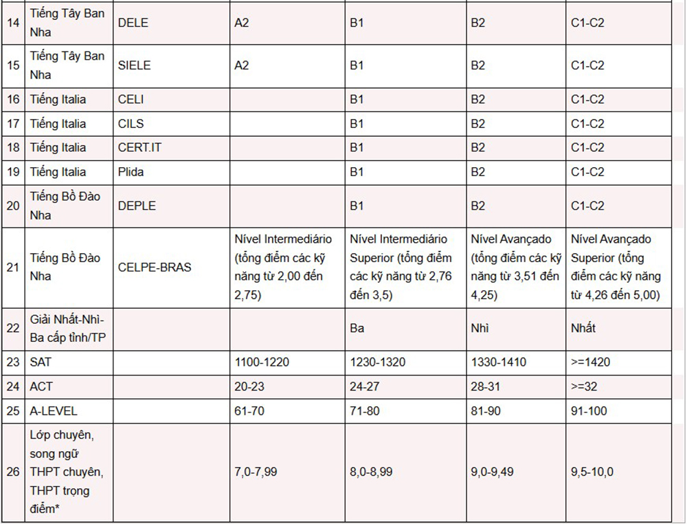 Bảng quy đổi mức điểm giữa các phương thức xét tuyển như sau:
