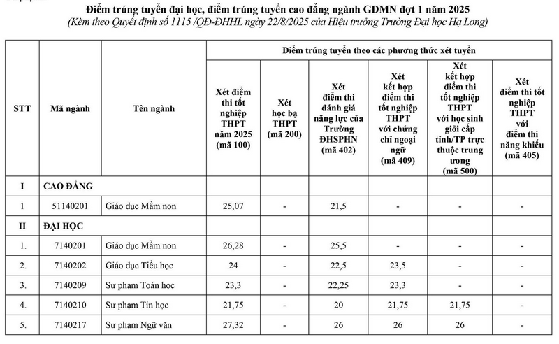 Trường Đại học Hạ Long chính thức công bố điểm chuẩn xét tuyển theo phương thức thi tốt nghiệp THPT năm 2025, dao động từ 15 đến 27,32 điểm, trong đó ngành Sư phạm Ngữ văn dẫn đầu với mức điểm chuẩn cao kỷ lục 27,32. Đây là điểm số quan trọng giúp thí sinh nhanh chóng xác định mình có “cửa” cạnh tranh vào các ngành sư phạm hay không, đồng thời điều chỉnh nguyện vọng một cách thông minh.