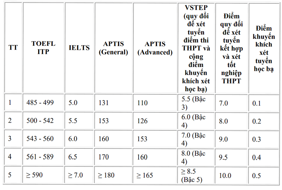 Mức quy đổi điểm và cộng điểm khuyến khích đối với thí sinh có chứng chỉ quốc tế môn Tiếng Anh để xét tuyển căn cứ điểm thi tốt nghiệp THPT, xét kết hợp và cộng điểm khuyến khích đối với xét tuyển học bạ. Chứng chỉ Khung năng lực ngoại ngữ 6 bậc dùng cho Việt Nam VSTEP chỉ dùng để quy đổi điểm thi tốt nghiệp THPT và cộng điểm khuyến khích xét học bạ; chứng chỉ SAT chỉ dùng để quy đổi đối với phương thức xét kết hợp và cộng điểm khuyến khích đối với xét tuyển học bạ. Cụ thể như sau: