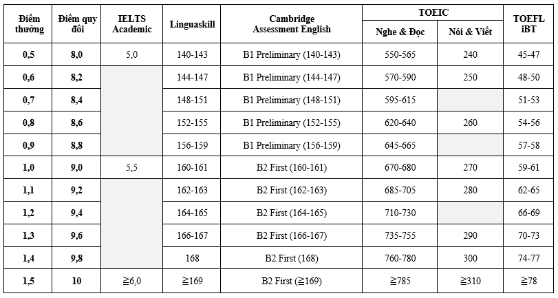 | Cơ hội cộng điểm hoặc quy đổi | Có thể được cộng 0.5 đến 1.5 điểm hoặc quy đổi thành 8–10 điểm môn tiếng Anh |