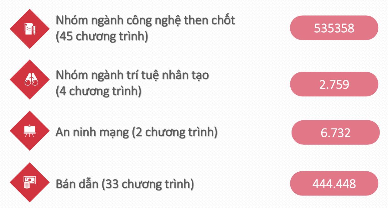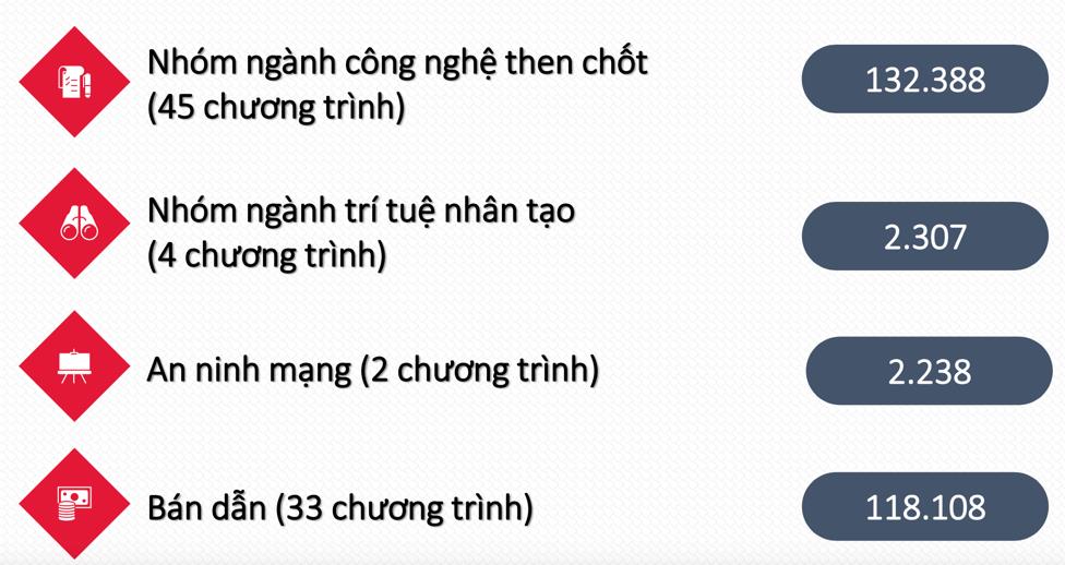 | Số ngành công nghệ chiến lược, kỹ thuật then chốt thu hút nhiều sinh viên | hơn 255.041 sinh viên chọn học trong các ngành như Khoa học máy tính, Trí tuệ nhân tạo, Vi mạch bán dẫn, An ninh mạng… |