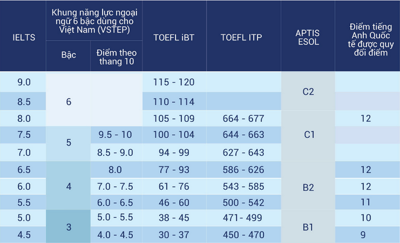 Thí sinh có các chứng chỉ tiếng anh quốc tế được chấp nhận ở Bảng 2 được quy đổi sang điểm ở Bảng 1 để cộng vào điểm xét tuyển.