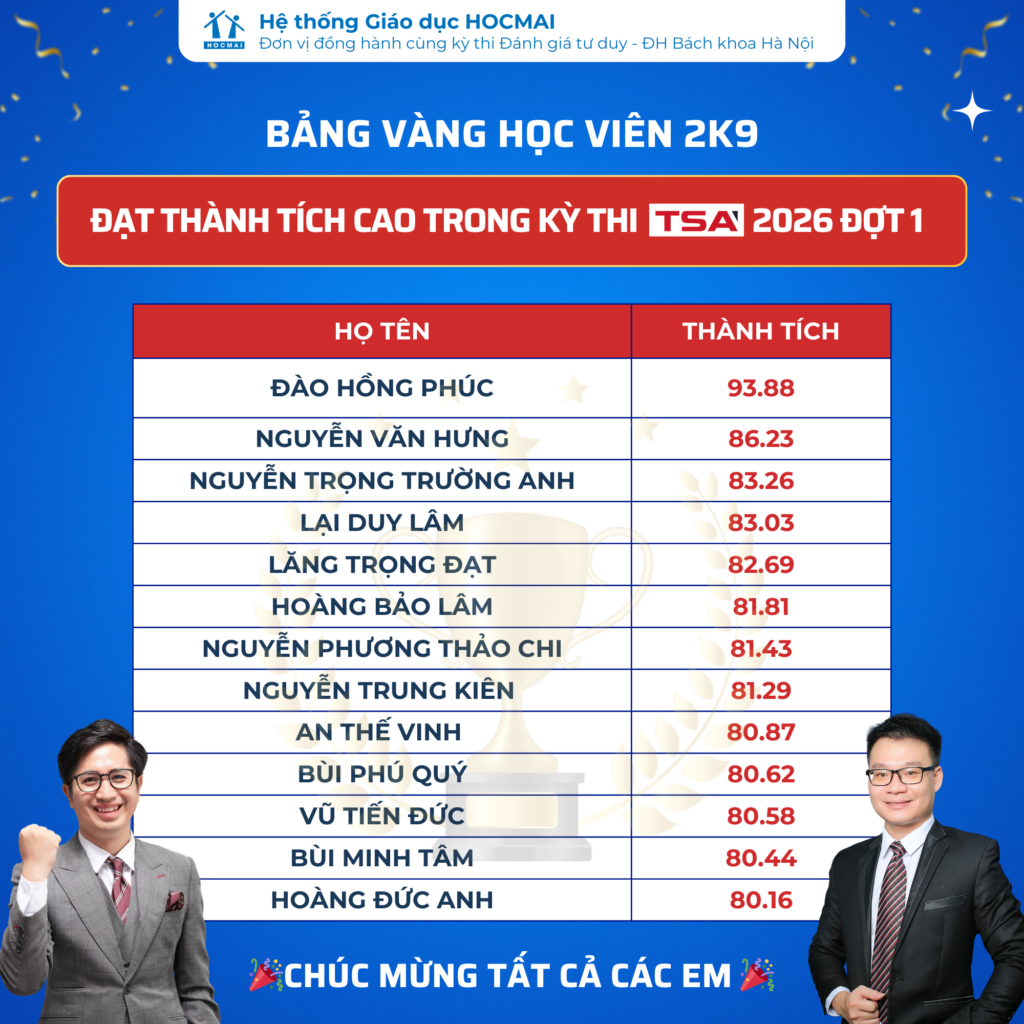 Kỳ thi TSA 2026 không chỉ là một cột mốc quan trọng trên hành trình chinh phục cánh cửa đại học, mà còn là minh chứng cho những tháng ngày học tập bền bỉ, kỷ luật và quyết tâm của các bạn học sinh. Ngay sau khi Đại học Bách khoa Hà Nội công bố kết quả đợt thi, nhiều học viên HOCMAI đã nhanh chóng báo điểm trong vòng 10 ngày theo đúng quy định của chương trình và hoàn thiện đầy đủ hồ sơ xác thực.